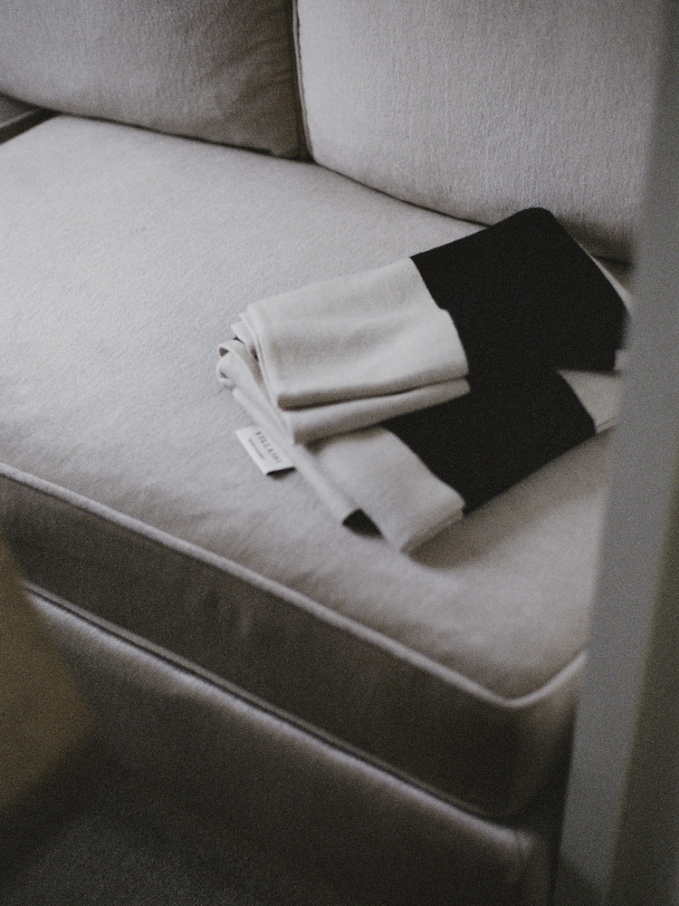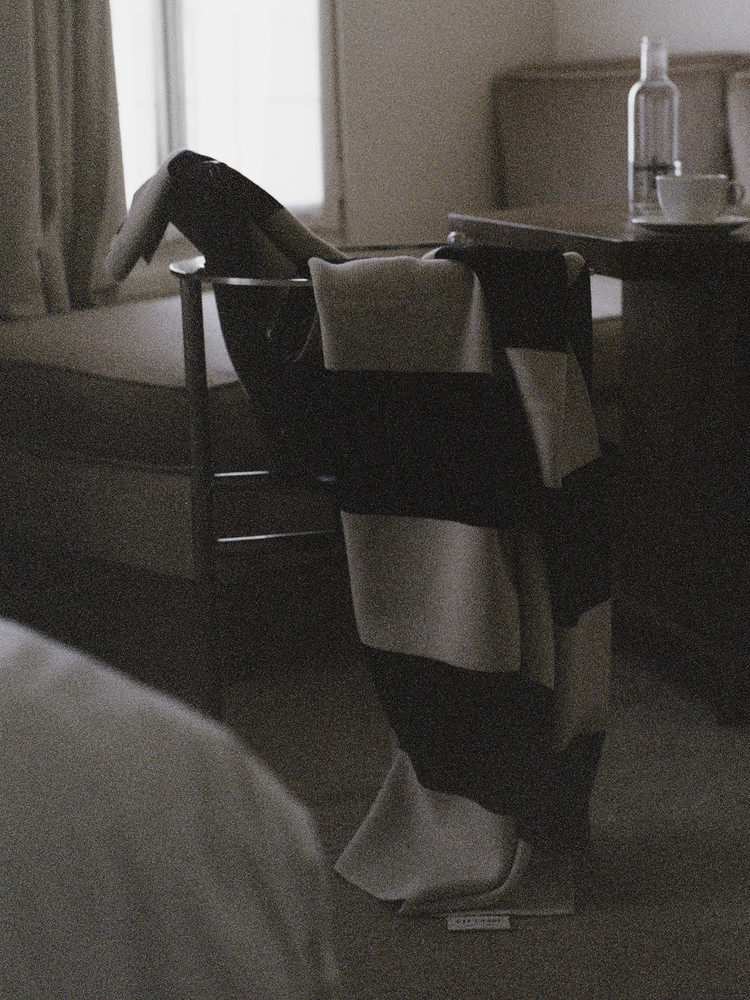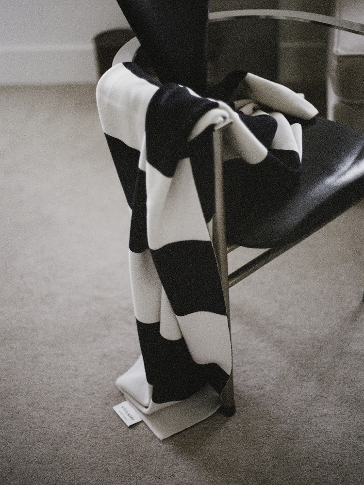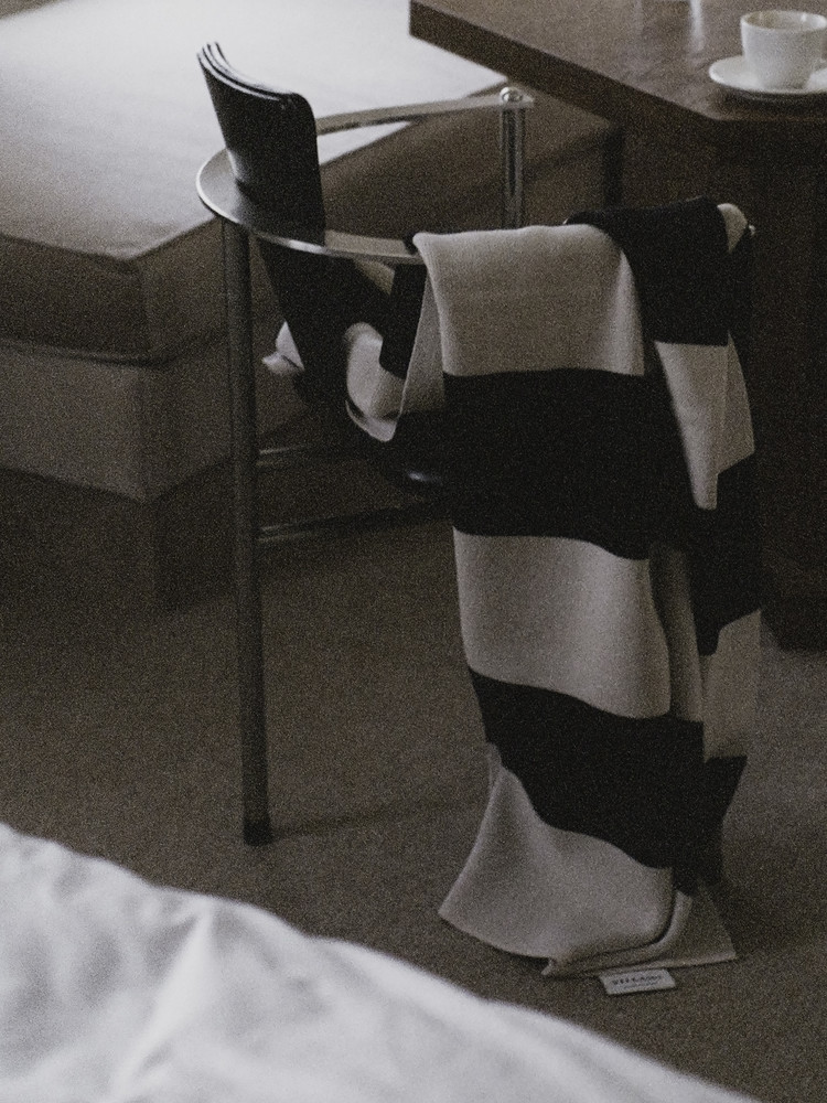 굵은 스트라이프 패턴이 공간에 차분한 리듬을 더하는 니트 블랭킷입니다.