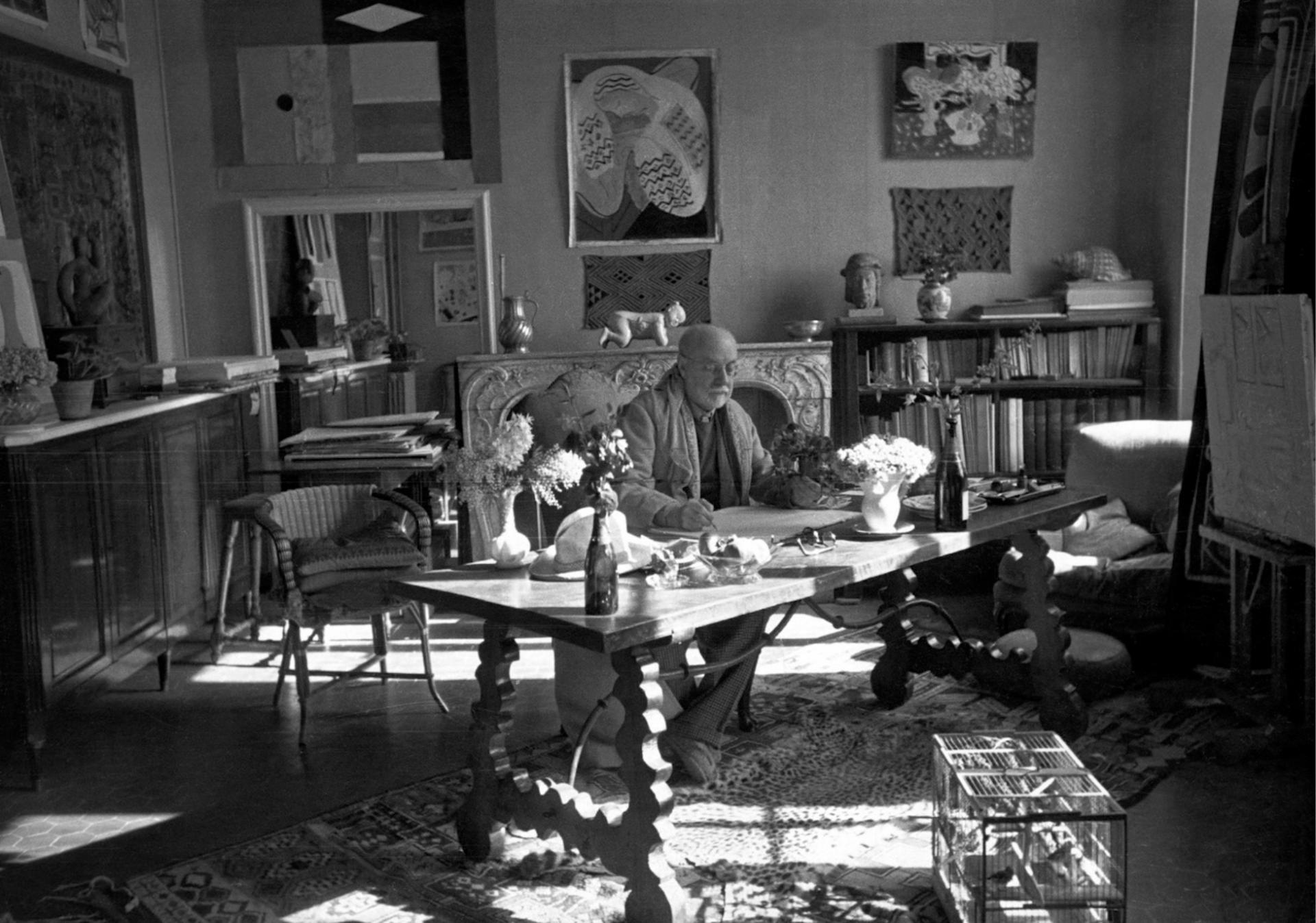 Henri Cartier-Bresson, Matisse with his collection of Kuba cloths and a Samoan tapa on the wall behind him, Villa La Rêve, Vence, 1944.