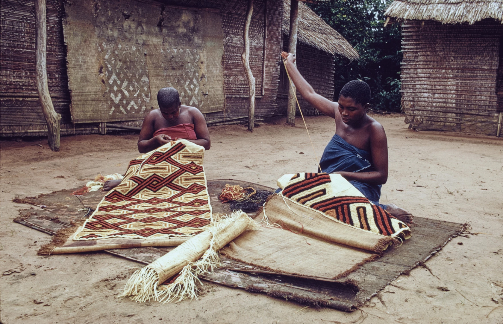 Kuba women decorating woven cloth in the Democratic Republic of the Congo, photographed in 1970.